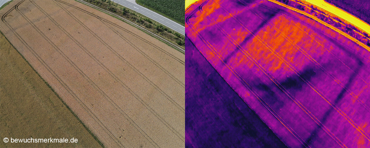 In der Normalaufnahme kaum zu erkennende Bewuchsmerkmale von 2 Kreisgräben zeigen sich in der Thermalaufnahme wesentlich deutlicher (Aufnahmedatum 24.06.2023) |