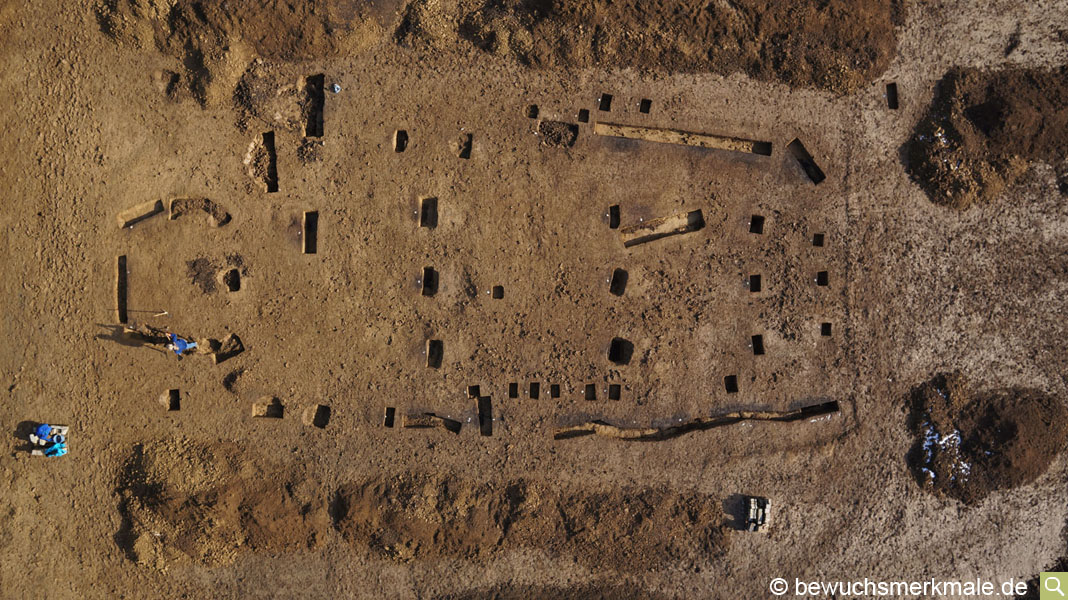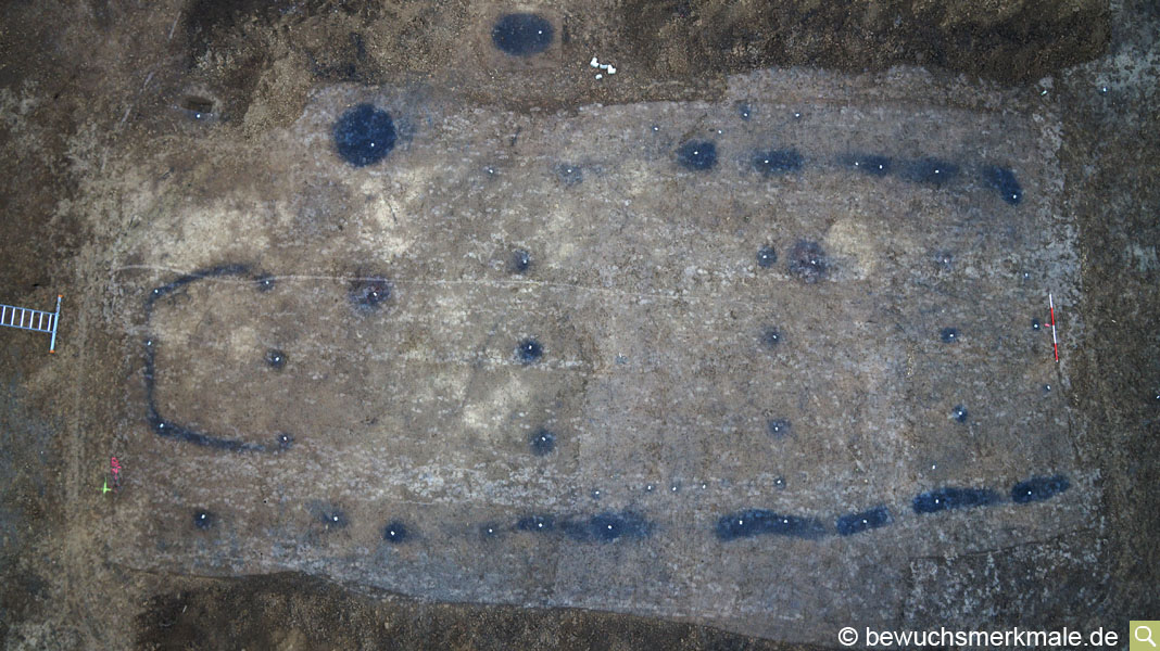ungestörter Hausgrundriss aus der Mittleren Jungsteinzeit durch dunkle Verfärbungen im hellen Lößboden ab. Der von der Ausgrabungsfirma geputzte