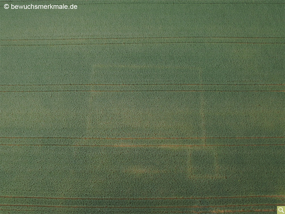 Dass Senkrechtaufnahmen von Bewuchsmerkmalen nicht unbedingt zu mehr Informationen führen, zeigt diese Detailaufnahme des Hauptgebäudes. Durch den