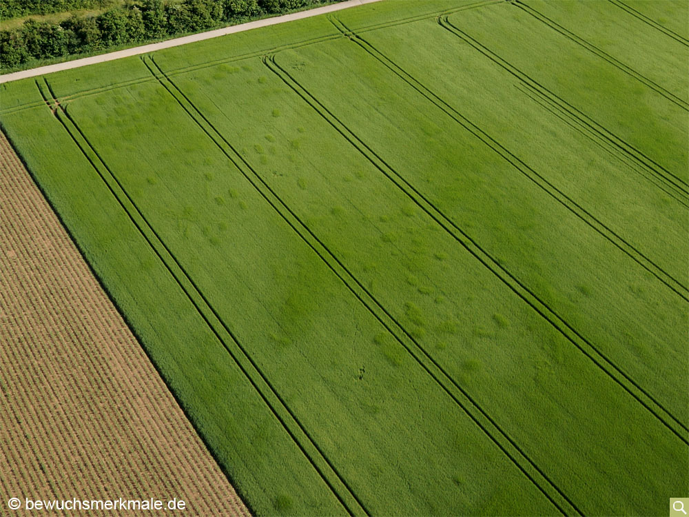 als positive Bewuchsmerkmale in der tiefstehenden Abendsonne zu erkennen. Die meisten sind NNW-SSO ausgerichtet und