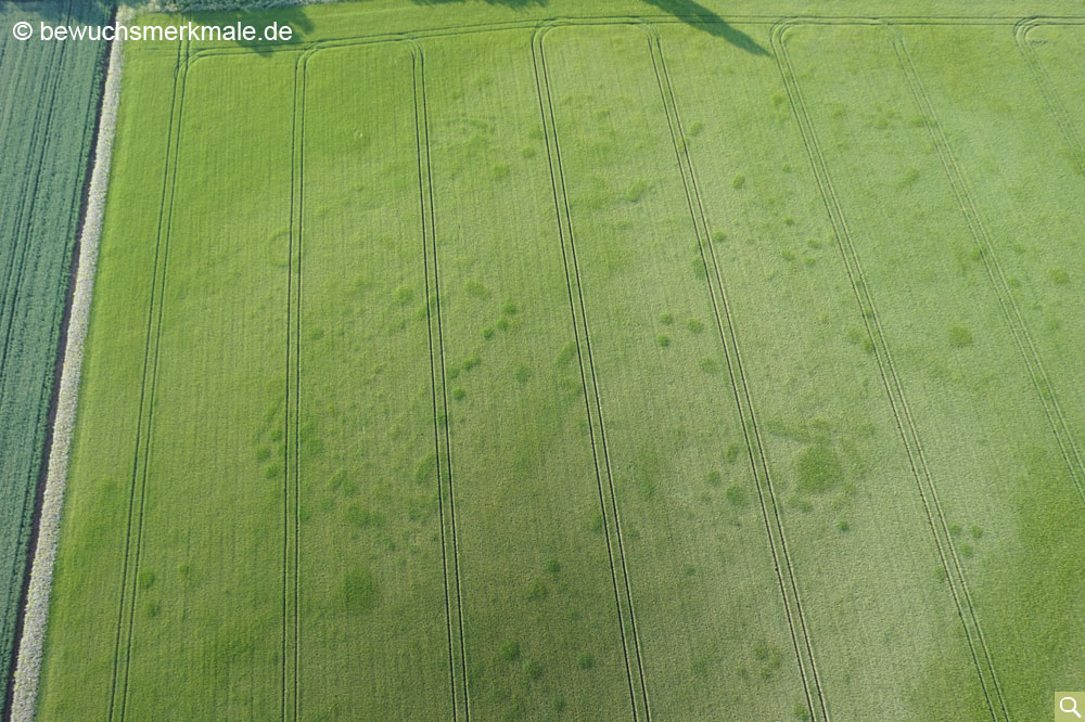 Nach dem sehr trockenem Frühjahr 2018 bildeten sich auf dieser Fundstelle Anfang Juni im Weizen wieder positive Bewuchsmerkmale aus. Der Detailreichtum der Gruben,