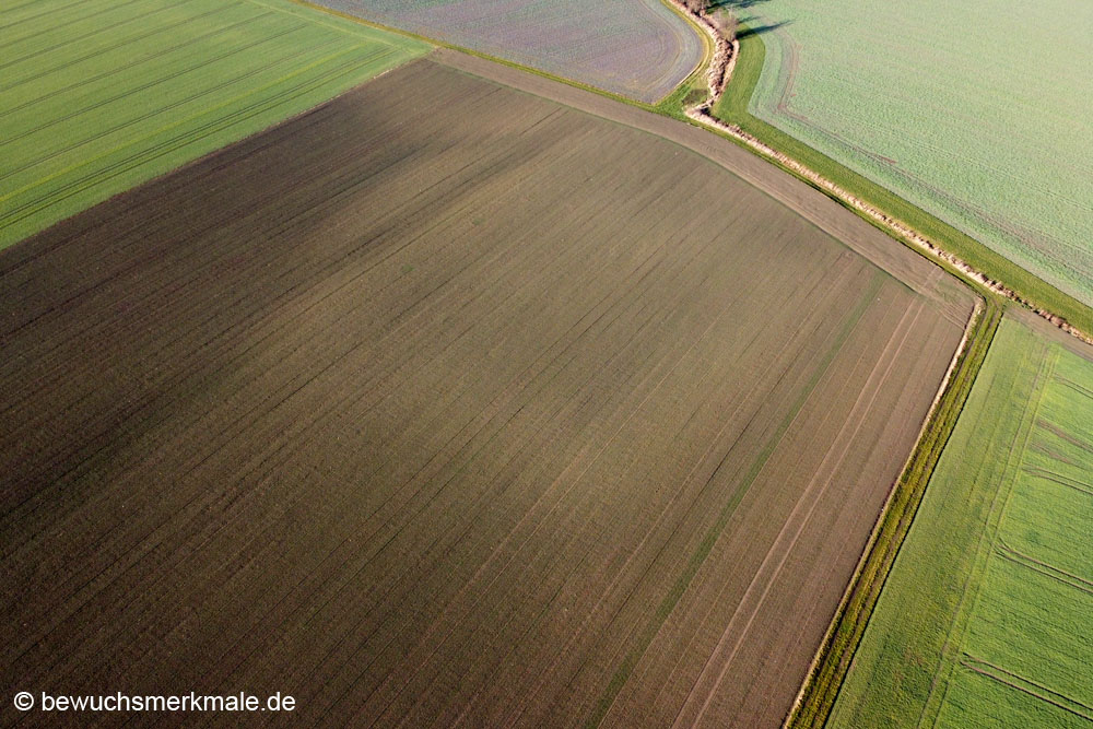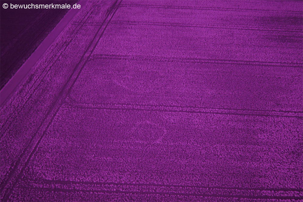 Positive Bewuchsmerkmale einer Ecke einer Viereckschanze in verschiedenen Wintergetreidesorten (Aufnahmedatum 28.04.2019) |