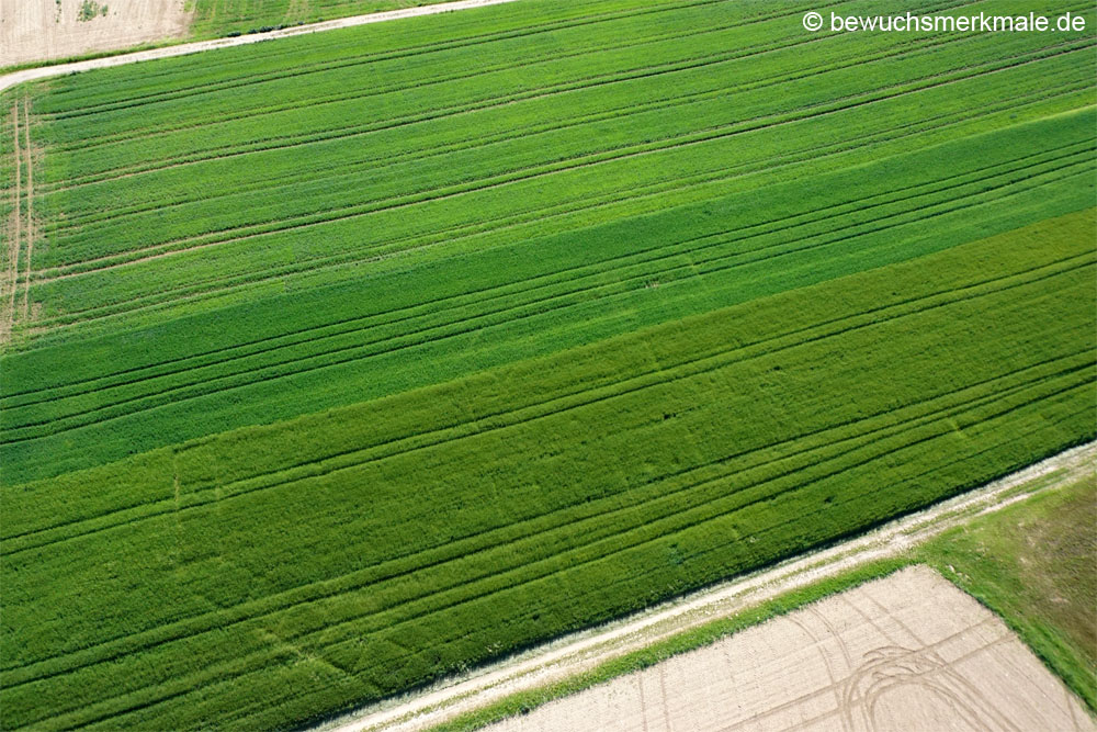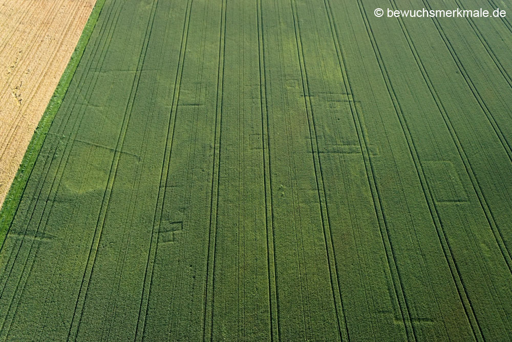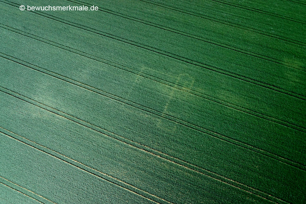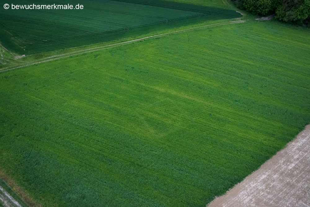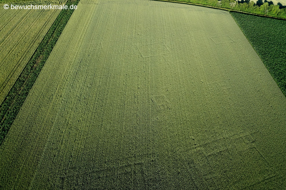 Leichte negative Bewuchsmerkmale des Hauptgebäudes einer römischen villa rustica in Wintergetreide (Aufnahmedatum 26.05.2019) |