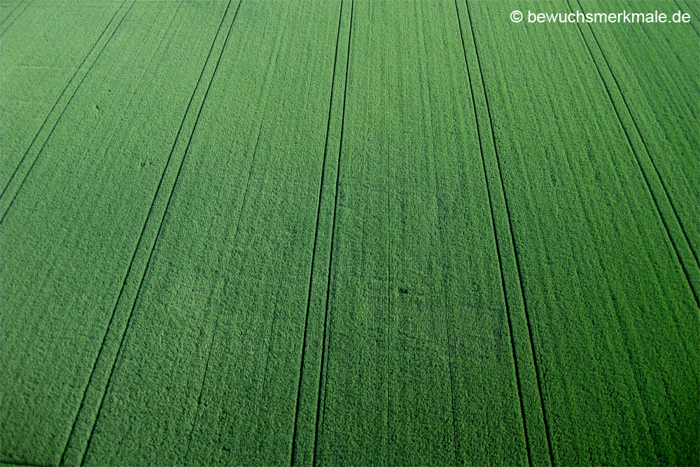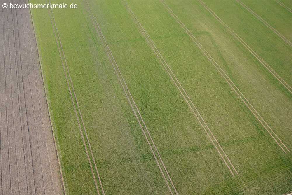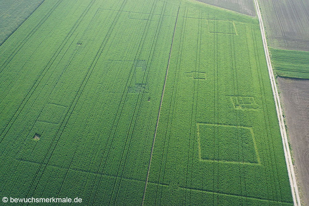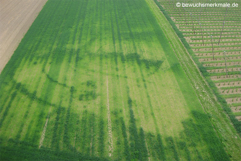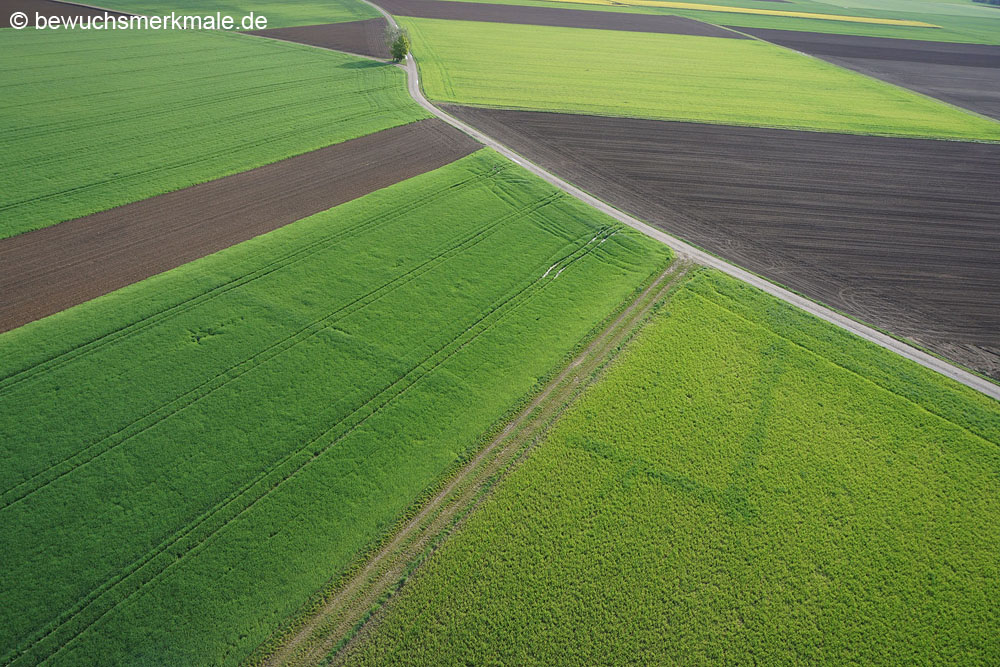 Leichte negative Bewuchsmerkmale des Hauptgebäudes einer römischen villa rustica in Wintergetreide (Aufnahmedatum 26.05.2019) |