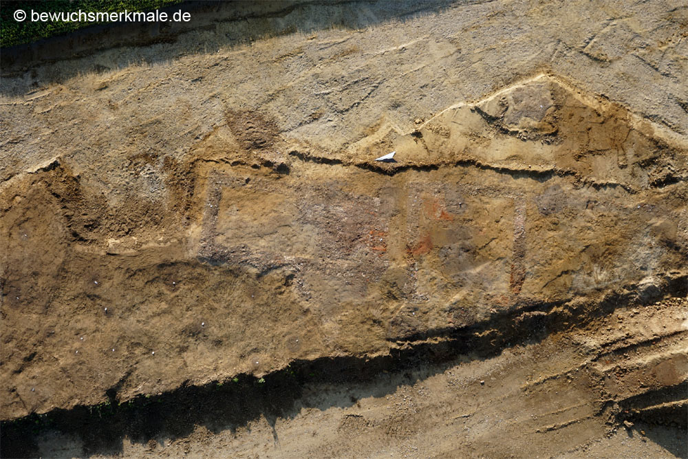 Kleines Hauptgebäude einer römischen villa rustica als negative Bewuchsmerkmale in Winterweizen (Aufnahmedatum 02.06.2019) |