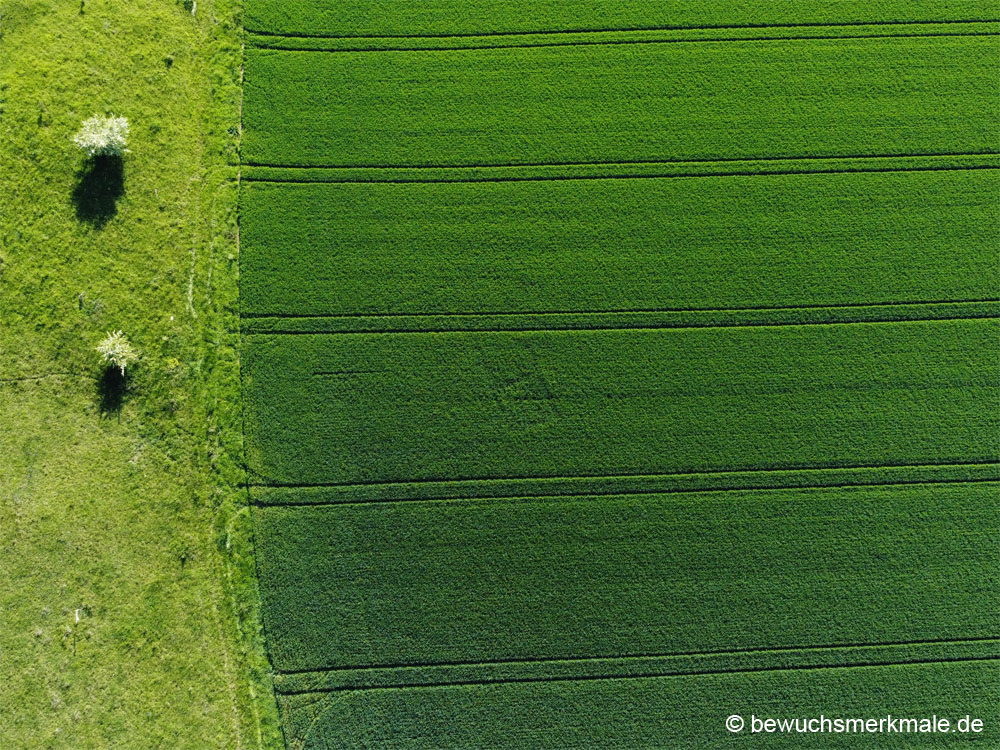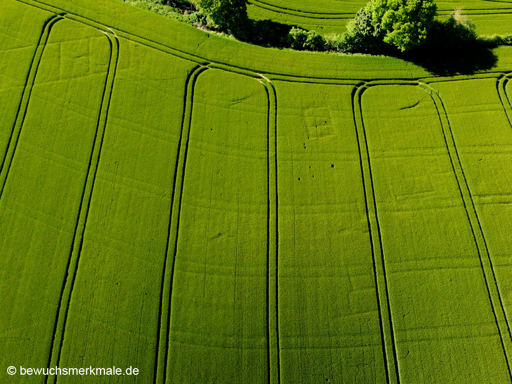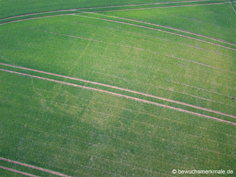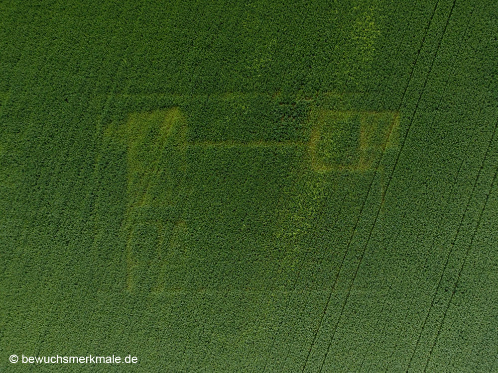 Die negativen Bewuchsmerkmale über dem sehr kleinen Hauptgebäude einer villa rustica bilden sich im Winterweizen nur gering aus (Aufnahmedatum 02.06.2021). |