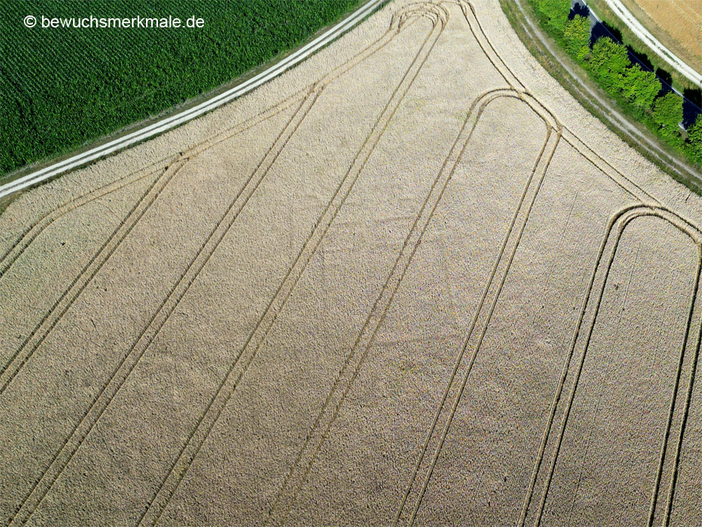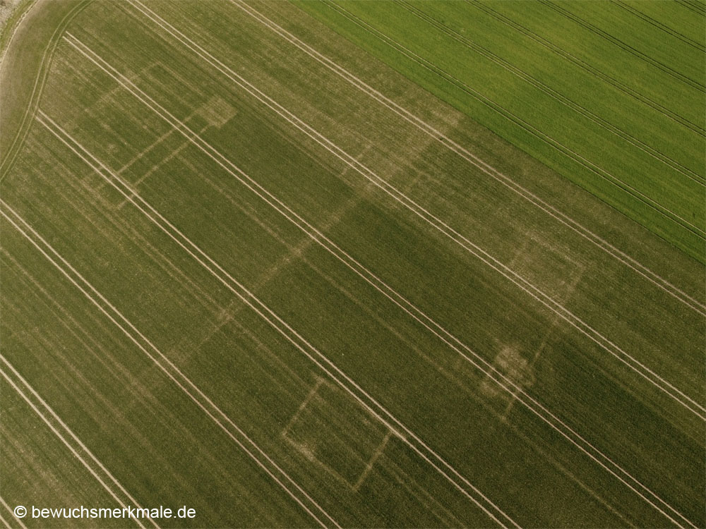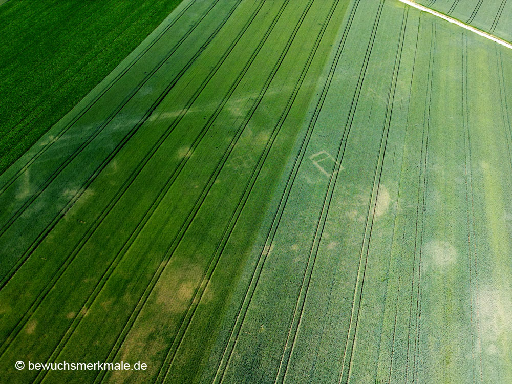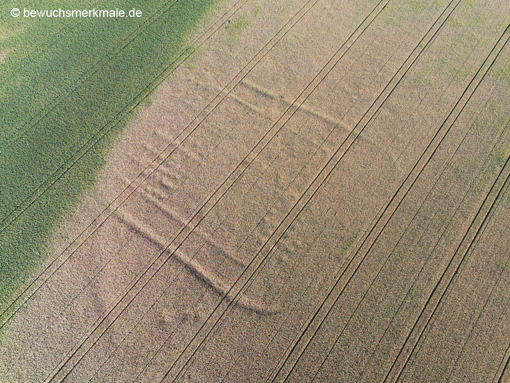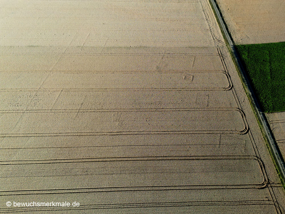 Durch negative Bewuchsmerkmale in einem Winterweizenfeld kann eine bisher nicht durch Luftbilder dokumentierte villa rustica nachgewiesen werden. Interessant ist die Aufreihung der einzelnen Gebäude entlang eines Weges (Aufnahmedatum 18.06.2022). |