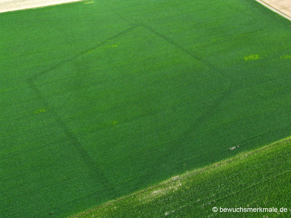 Dass Soja auch ein gutes Medium für positive Bewuchsmerkmale sein kann, beweisst diese Aufnahme einer spätlatènezeitlichen Viereckschanze mit Annexgräben (Aufnahmedatum 20.07.2022). |