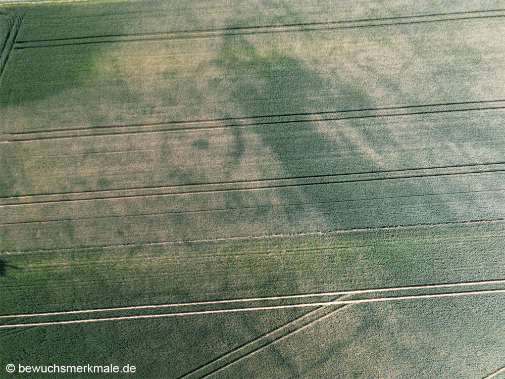 Positive Bewuchsmerkmale von Kreisgräben und Zentralbestattungen in einem Winterweizenfeld zeigen an, dass sich im Boden noch die Überreste von ehemaligen Hügelgräbern befinden (Aufnahmedatum 18.06.2022). |