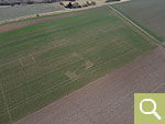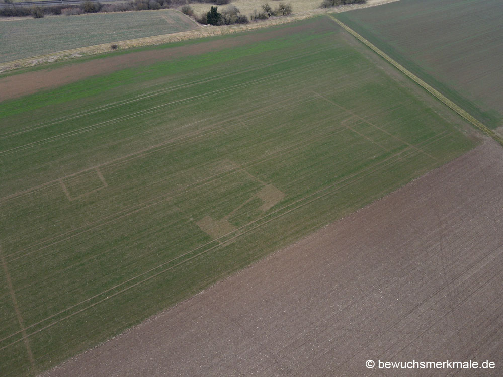 Die noch im Boden befindlichen Reste eines Haupt- und eines Nebengebäudes einer villa rustica werden aufgrund von negativen Bewuchsmerkmalen sichtbar (Aufnahmedatum 23.02.2023). |