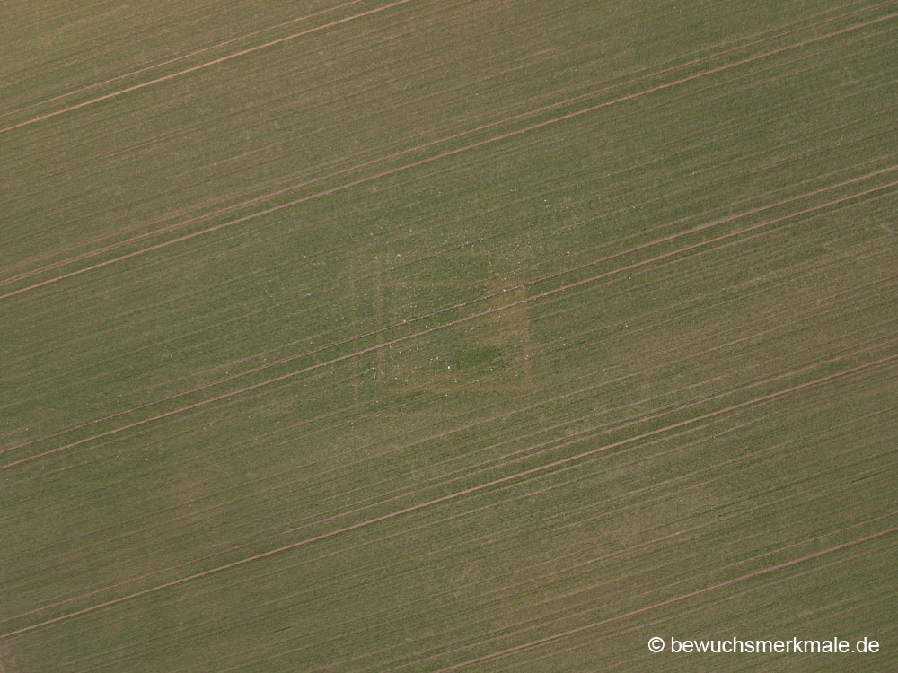 Die Ost-West ausgerichteten Gräber eines fühmittelalterlichen Reihengräberfeldes werden für kurze Zeit aufgrund positiver Bewuchsmerkmale in Wintergerste sichtbar (Aufnahmedatum 22.06.2023). |