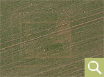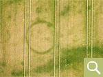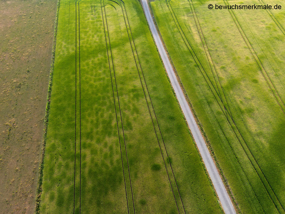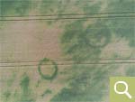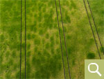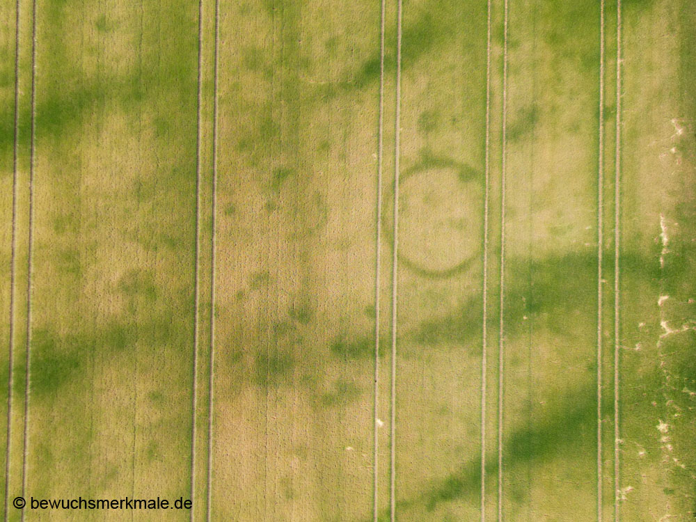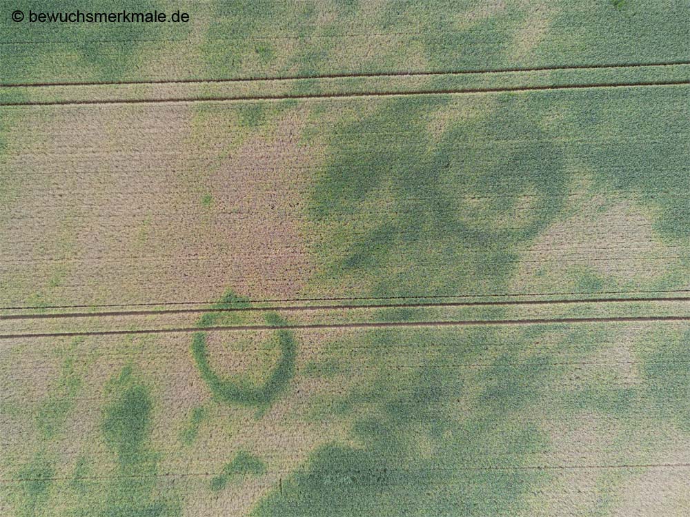 Positive Bewuchsmerkmale zeichnen die noch im Boden befindlichen Kreisgräben von ehemaligen Grabhügeln nach (Aufnahmedatum 24.06.2023). |