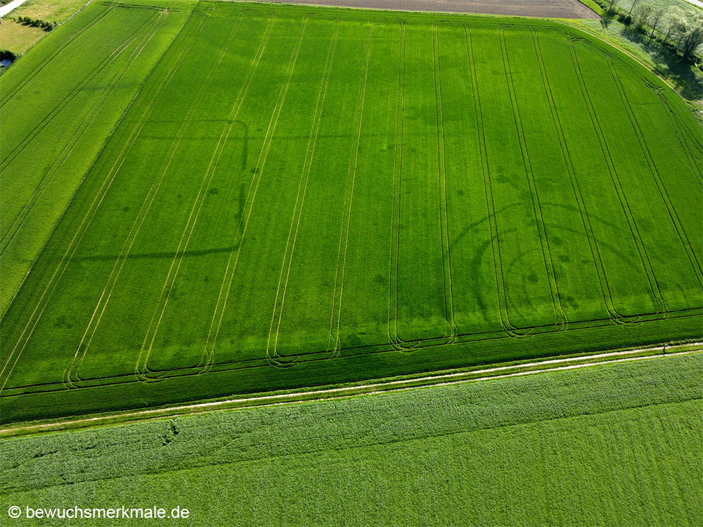Die bekannten Grabenwerke der Kreisgrabenanlage von Viecht zeigen sich Anfang Mai in einer einmaligen Deutlichkeit (Aufnahmedatum 04.05.2024).