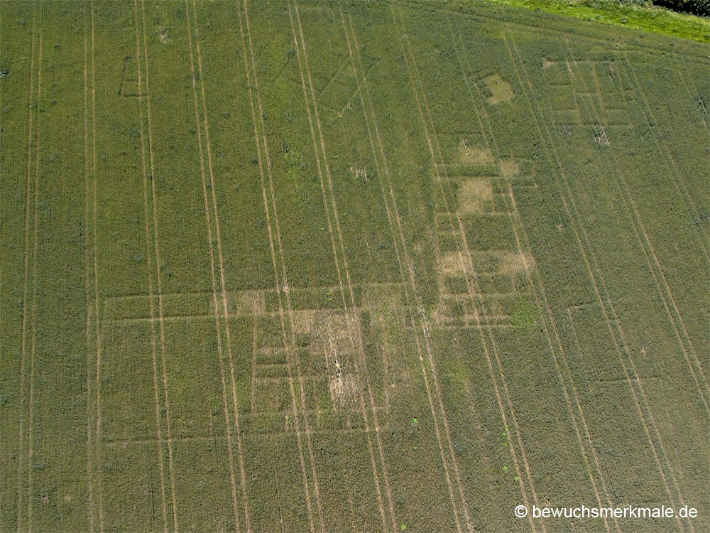 Ein lange bekanntes römische Landgut zeigt sich kurz vor der Reife sehr detailreich aufgrund negativer Bewuchsmerkmale im Winterweizen (Aufnahmedatum 18.06.2024).