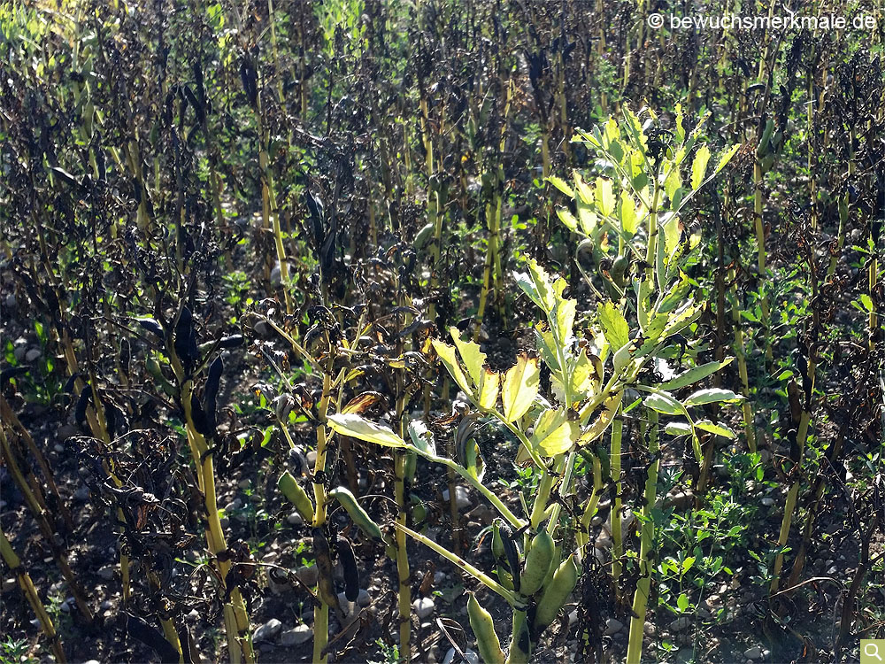 Die Ackerbohne zeigt aufgrund ihres hohen Wasserbedarfs in Trockenperioden schnell unterschiedliche Bodenbeschaffenheiten in Form von Wachstums- und Ausreifungsunterschieden an. Besonders deutlich werden diese in der Reifungsphase, wenn gut versorgte Pflanzen noch eine grüne Blattfarbe haben, Pflanzen auf trockeneren Untergrund aber bereits in die braun-schwarze Färbung übergehen und die Blätter welk werden.Beispiele