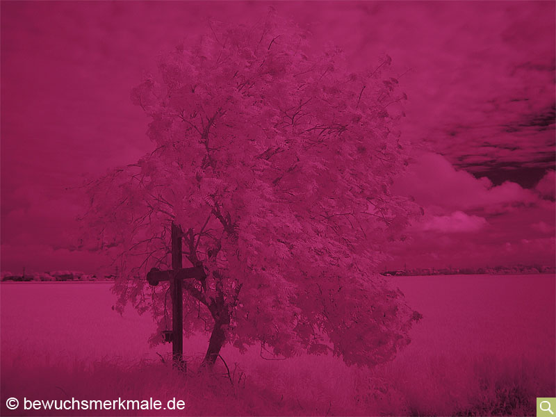 Plants are usually shown white on IR images because the chlorophyll contained in the plants is transparent in the IR range and the IR radiation is reflected by the water in the leaves. This is a protective mechanism of the plants in order not to burn by absorbing too much IR radiation from the sun. This effect is named after the American physicist Robert Williams Wood.