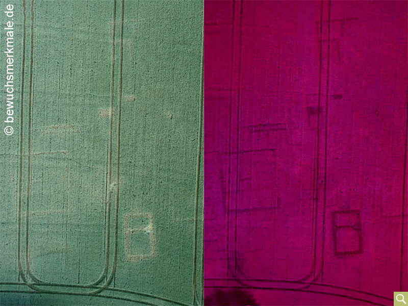For infrared shots with the multicopter I use a Sony Nex 5 camera with the IR cut filter replaced by a normal lens. An IR filter with a threshold value of 850nm is placed in front of the lens. As far as possible, I first fly over areas where cropmarks are expected with a normal camera and then with the IR camera. It has often been shown that both types of recording complement each other and, in combination, provide additional insights.