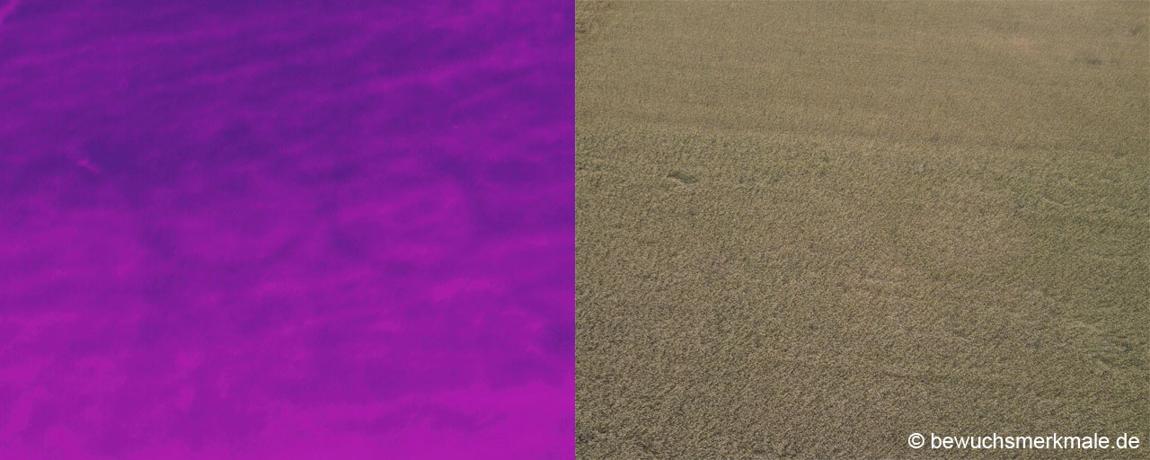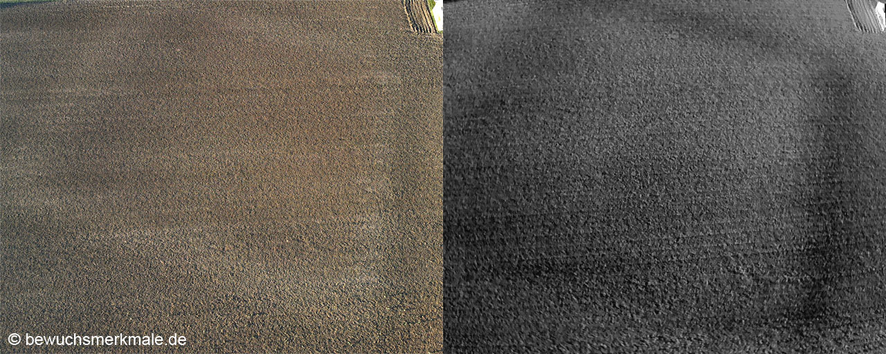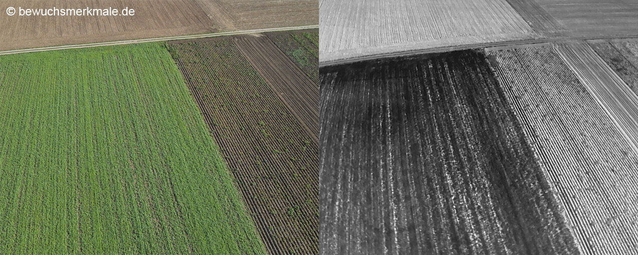 Junge Senfpflanzen bilden Thermalmerkmale eines Kreisgrabens mit Zentralbestattung aus. In der Normalaufnahme sind keine Merkmale zu erkennen (Aufnahmedatum 12.09.2022) |
