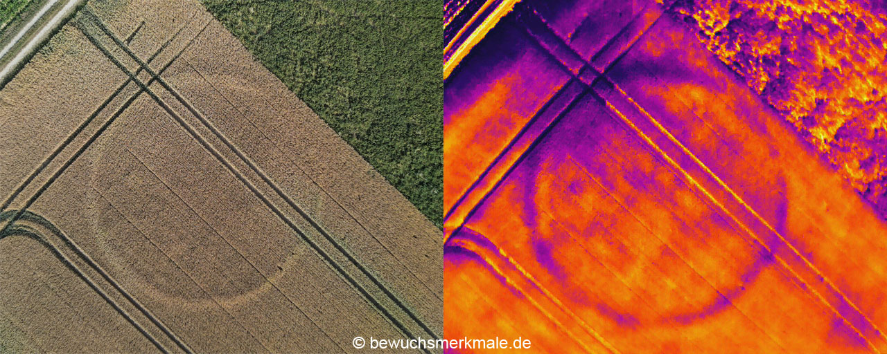 Vergleichsaufnahme von positiven Bewuchsmerkmalen und Thermalmerkmalen eines Kreisgrabens (Aufnahmedatum 02.07.2025) |