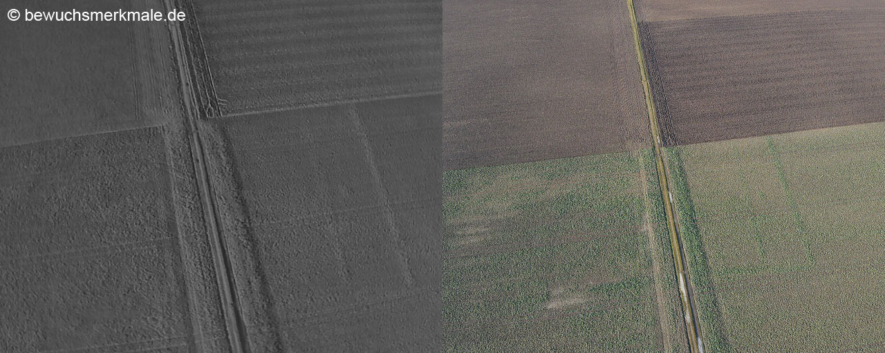 In Abb.1 sind auf der Normalaufnahme in dem mit Raps bewachsenem Ackers rechts des Feldweges die deutlich höher gewachsenen Pflanzen im Bereich der Gräben zu erkennen. Durch die tiefstehende Sonne verursachen diese Pflanzen auch einen kleinen Schlagschatten, der die linearen Strukturen noch deutlicher hervorhebt. Interessanterweise zeigen sich in dem links neben dem Feldweg befindlichen und auch mit Raps bestellten Acker keine eindeutig zu erkennenden Bewuchsmerkmale, obwohl sich die Gräben der Viereckschanze hier fortsetzen.