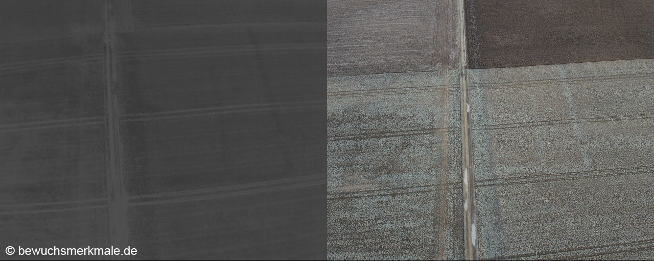 In der Normalaufnahme (Abb. 2) ist gut zu erkennen, dass die Blätter der Rapspflanzen noch leicht bereift sind. Trotz der fehlende Schlagschatten sind die Grabenverläufe deutlicher nachvollziehbar als auf der Aufnahme vom 27.12.2022. Auch die Fortsetzung des einen Grabens in das links benachbarte Feld meint man erkennen zu können. Interessant ist die Thermographieaufnahme zu diesem Zeitpunkt: Die Grabenverläufe sind als dunklere Streifen zu erkennen, d.h. die höher gewachsenen Pflanzen sind ausgekühlter als ihre bodennaheren Nachbarpflanzen.